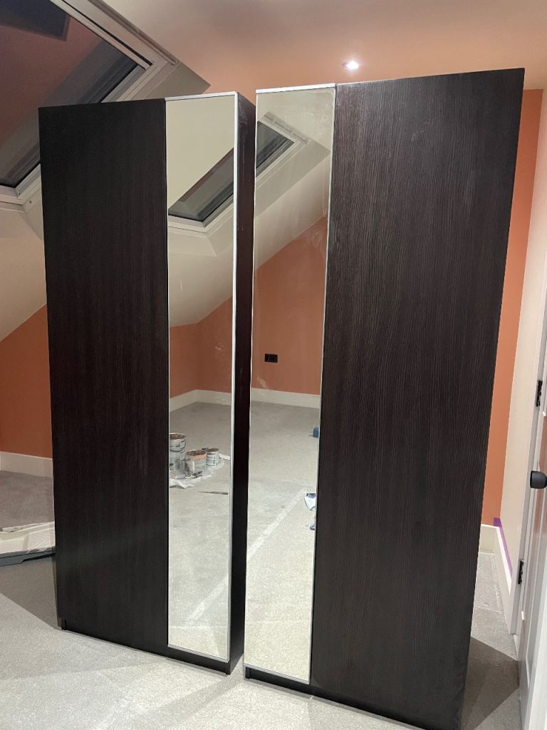 Two IKEA wardrobes. Were left by previous home owner and not wanted. Each unit comes with 2 clothing rails and one shelf. Can be adjusted as required. Each unit has one large door and one narrow door with full length mirror. Each unit measures app
