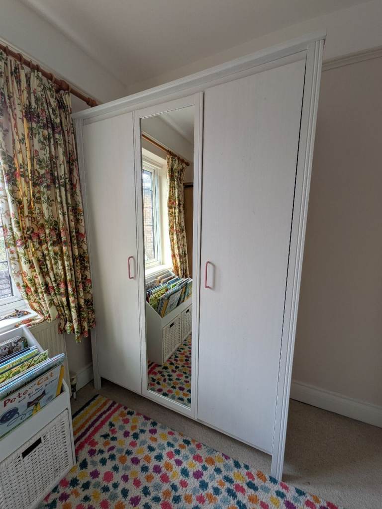Ikea Pax wardrobe with mirrored sliding doors. Great condition, just too big for us now. Slight gap on left door of wardrobe when closed (see photos) but hardly noticeable and doesn’t affect usage. Buyer to dismantle. Comes with instruction manual