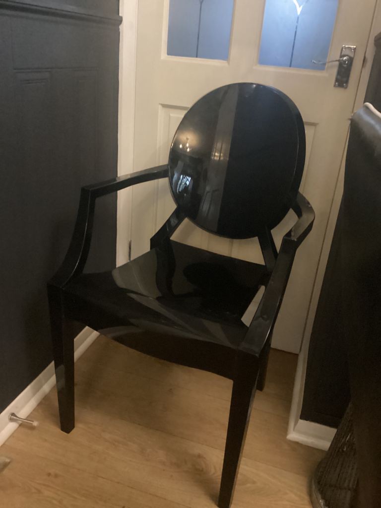 Kartel style chair plastic in black, would be suited anywhere in your home,tex for a wicker reply.so197 Southampton.cash only.thanks.
