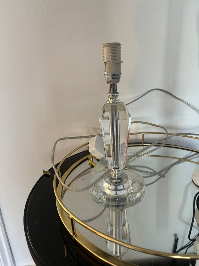 Elegant cut glass crystal style table lamp base in the style of Laura Ashley. Classic design with chrome stem and faceted glass base, perfect for bedside tables, dressing tables, or cottagecore interiors. Details • Height: 25 cm • Base diamet