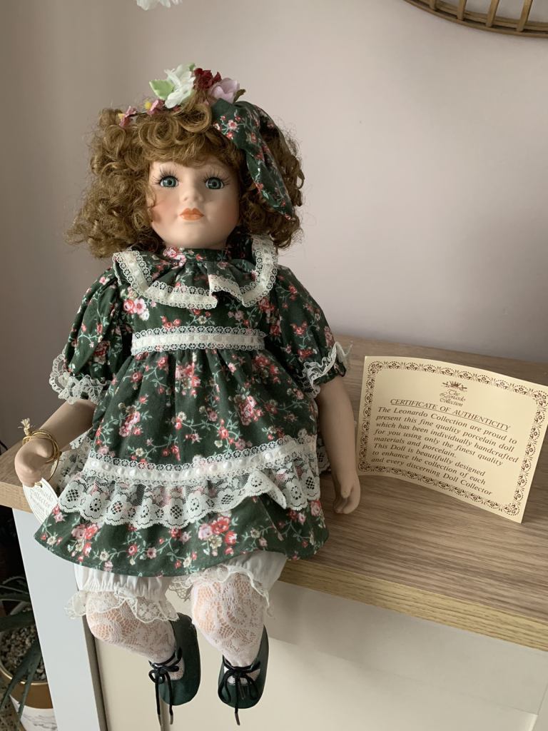 Beautiful Leonardo collectable 16” Porcelain Doll “Jacqueline” sits lovely on a shelf or dressing table. Complete with certificate of Authenticity and original box
