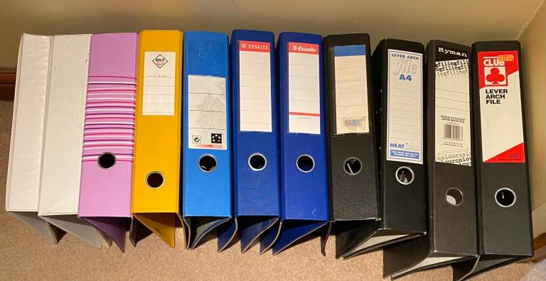 We have 2 lever arch files, 20+ standard A4 folders and 2 box folders to give away to anyone who can make use of them. Collection only.