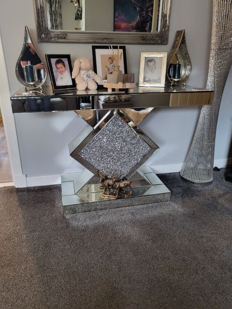 Lovely set of mirrored tables with crushed diamond detail, perfect for a living room or hallway. The console table is quite striking and in good condition, showing only minor wear. The matching side tables are also in good shape and would work well a