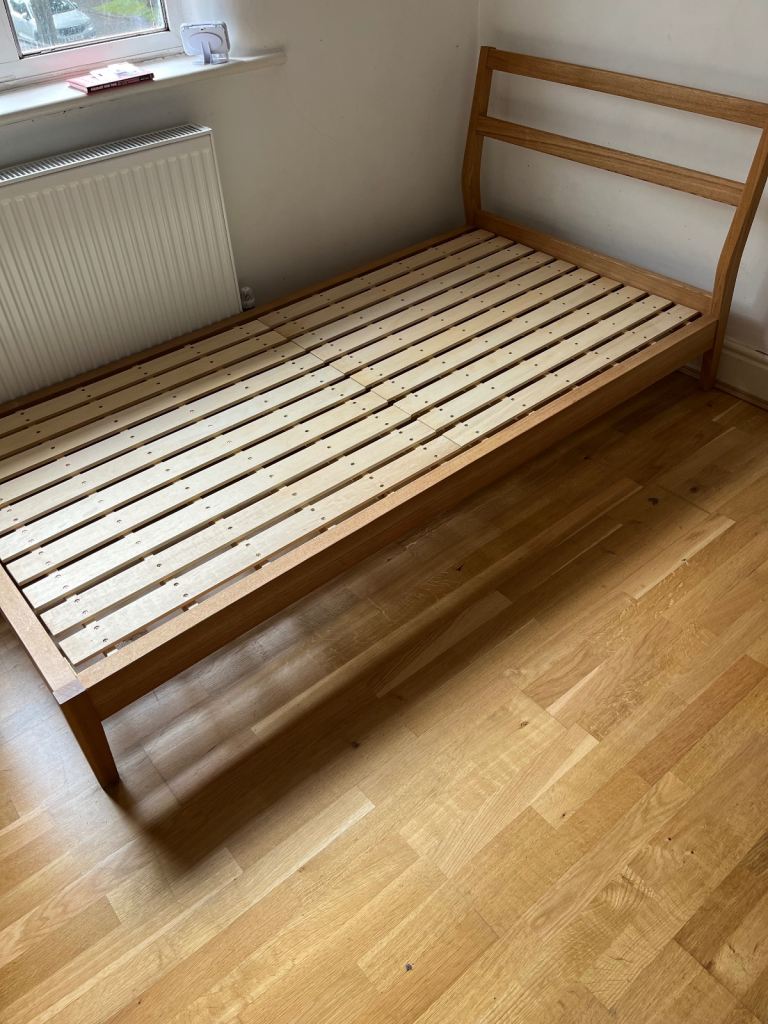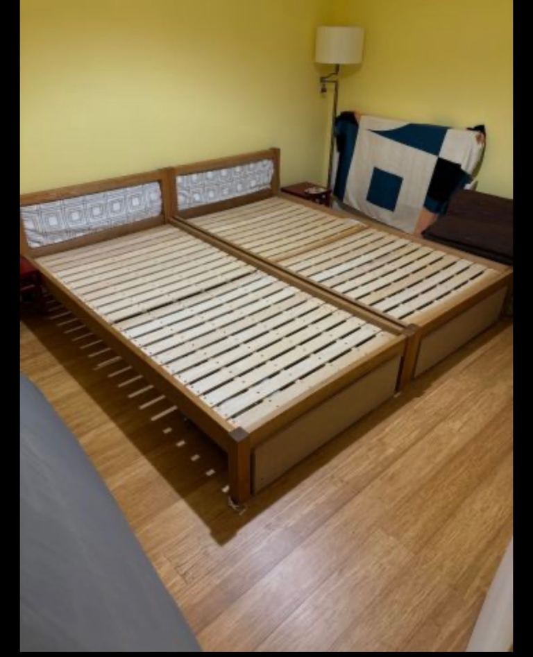 Muji wooden bed frame (Oak). Dismantled. This is an add for the frame only. Screws are missing but can be bought online for less than £10.00.