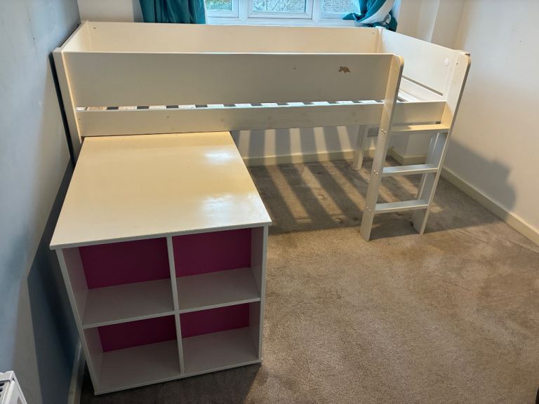 Cabin bed with pull out desk Measures: L197cm x H 110cm x W 98cm Desk extends to 83cm Back panel of desk is reversible blue / pink Free to collector as needs to go ASAP Some marks where stickers have been removed / child has drawn on it, but thi