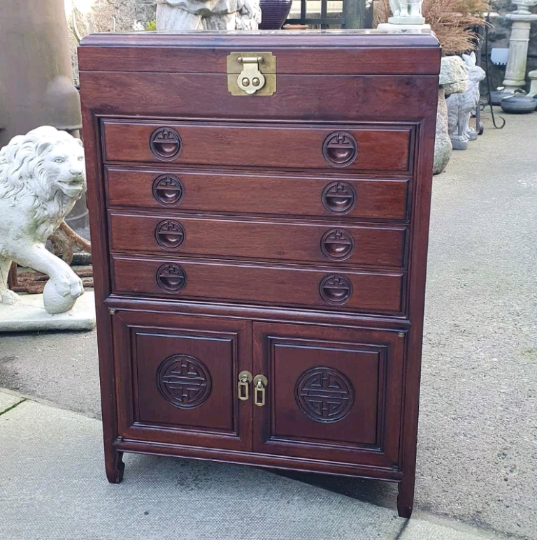Oriental Dark Wood Cutlery Cabinet/ Drawers with Green Felt Lining. Ideal collectors cabinet. H32 W22 D14 Inches Ref/17482 £225 Wide selection of cabinets always in stock. Delivery available across the UK and postage available worldwide. Three