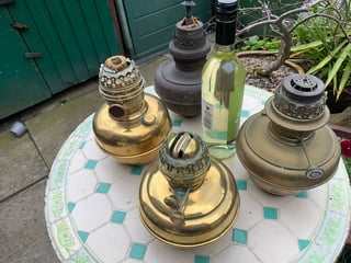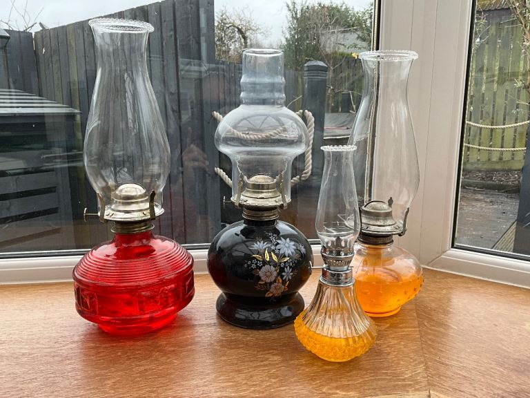Set of 4 Paraffin Lamps. 3 large and 1 small, All come with chimneys, wicks and paraffin. Comes from a pet and smoke free home. Ready to light and in great condition! £65 for the set ono All sensible offers considered!