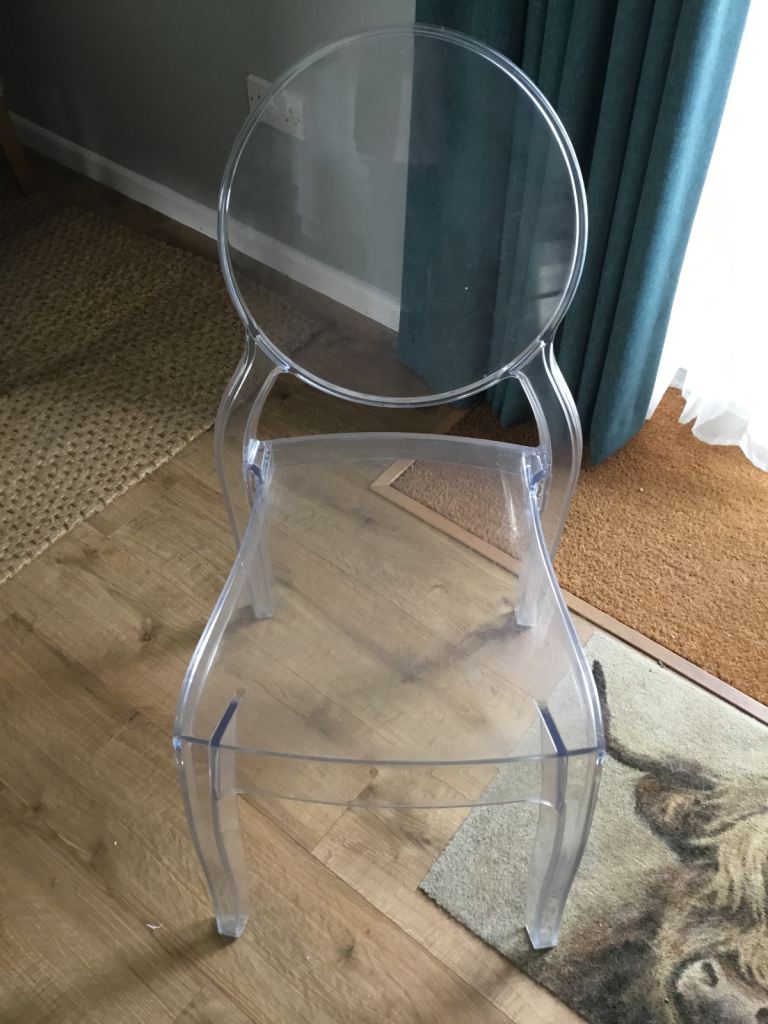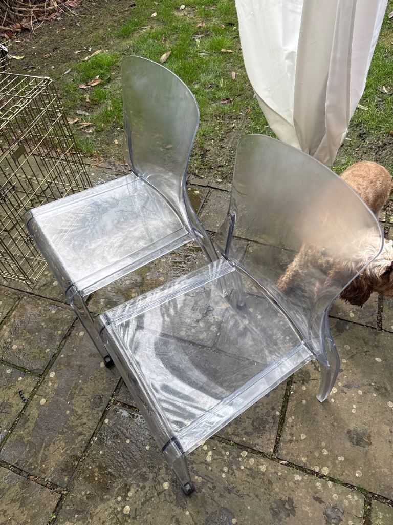 Once a high end two chair set set and much loved but now time to go to a household that wants and can use that kind of vibe. We cushion them up and use fur throws but equally funky in a kitchen bare. Lots of scratches lots of stories! They stack and