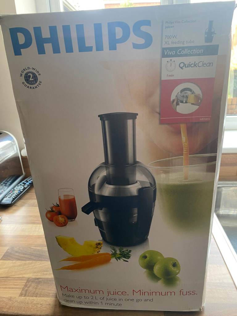 Philips Viva Collection Juicer (https://www.home-appliances.philips/gb/en/p/HR1855_70). Almost new. No longer needed. Compact and easy to use. Good quality juicer. No box and collection only.