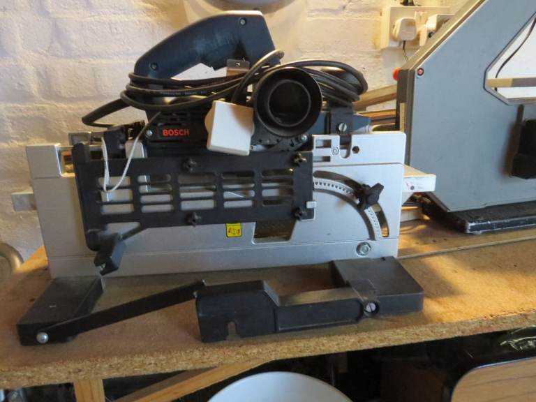 Bosch Electric hand held planer with Thicknesser attachment all in good working order. Adapter to connect to vacuum to collect shavings. Thicknesser max width 80mm X 80mm. Surface planning guide tilts to give variable angles. Inst booklet.