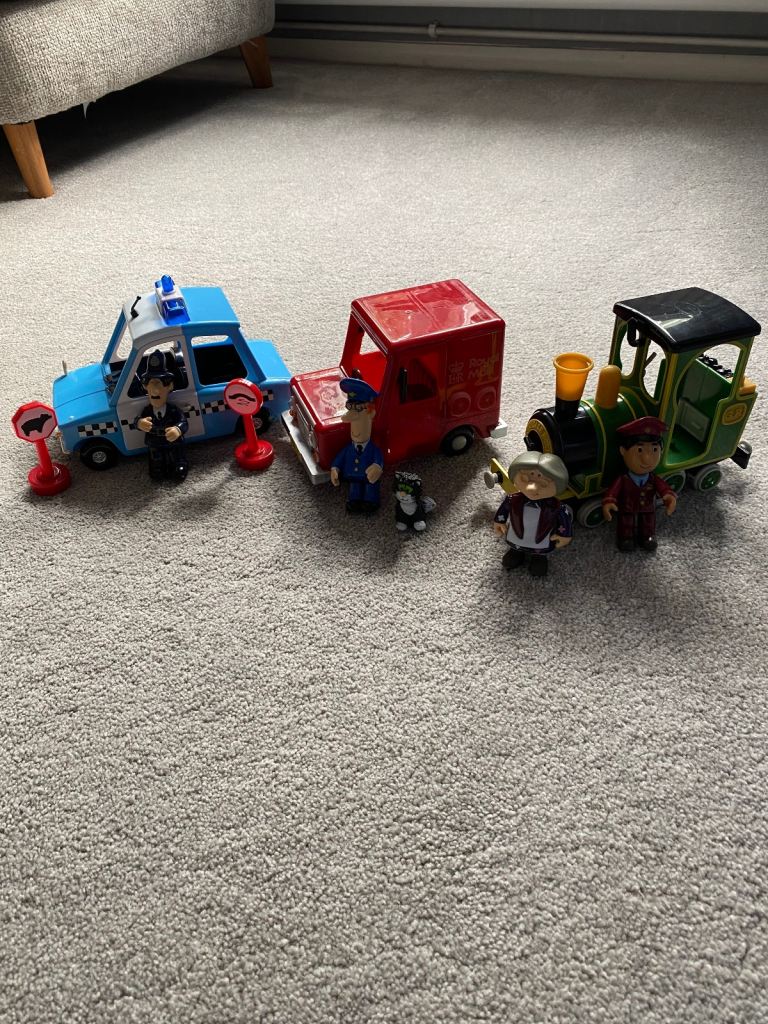 A set of Postman Pat vehicles with figures. The police car has a wing mirror missing apart from that they are in good condition.