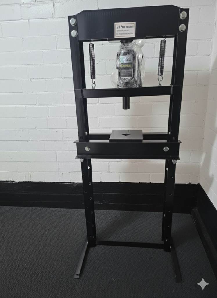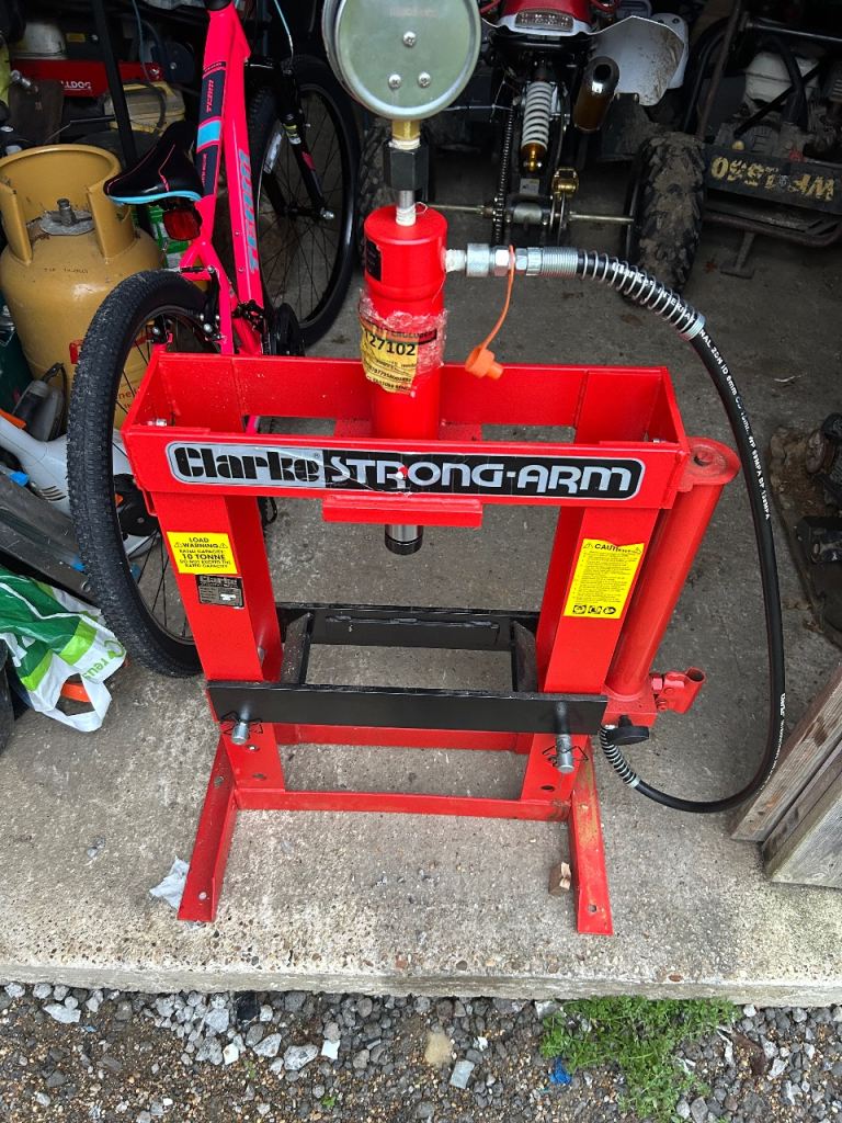 Basically new Clarke 10 tonne press with hydraulic pump,ram with pressure gauge and connecting hose