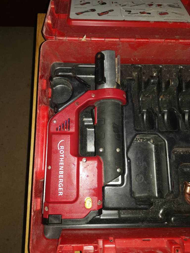 Part of a find Rothenberber Romax Compact pipe compress tool (FAULTY) unit powers up but does not close jaws so to be fixed or repaired £70 including carry case Rothenberger 18v battery charger £30 each Rothenberger 2amp battery 18v £30 each Rothe