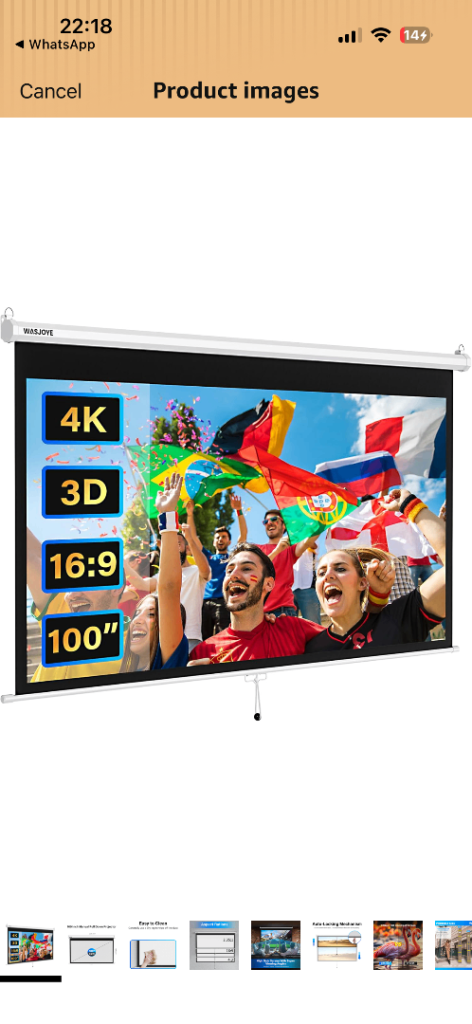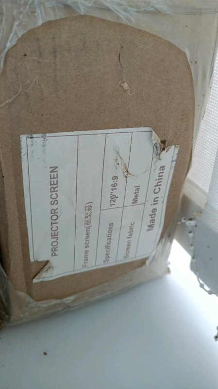 As new. Currently in box. Original price £98.98 from Amazon: WASJOYE Manual Pull-Down Projector Screen - 100-inch Roll-Down Retractable Manual Projection Screen w/Auto-Locking, Adjustable Screen Height, Black Masking Border. Link to Amazon listing: h