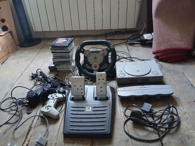 Retro Gaming Bundle: PS1 Console, Steering Wheel, Pedals, Controllers & Games