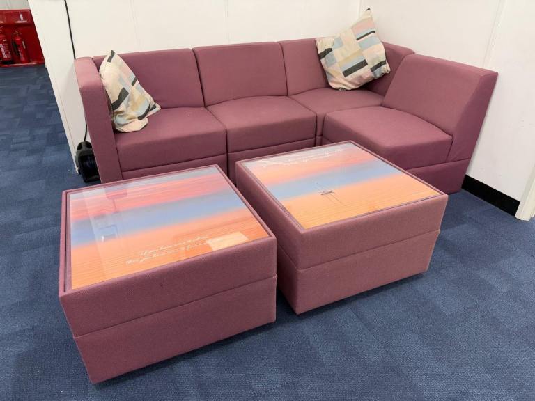 Reception corner sofa with 2 x tables as shown in photo. This is in used condition so please don’t expect perfect. Still has life left in it.