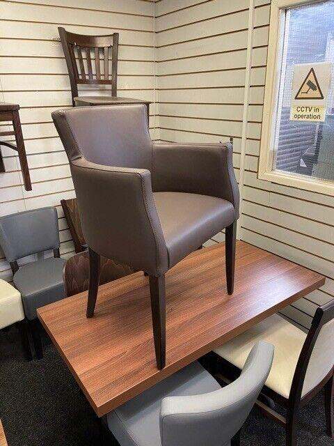 Restaurant Leather Arm Chair Model 1934 Brand New Cancelled Order ideal for Pubs, Clubs, Bars Nationwide Delivery Available in Chocolate Brown, Black, Grey 1934 arm chair is a sturdy chair made with solid beech finished in a walnut stain with