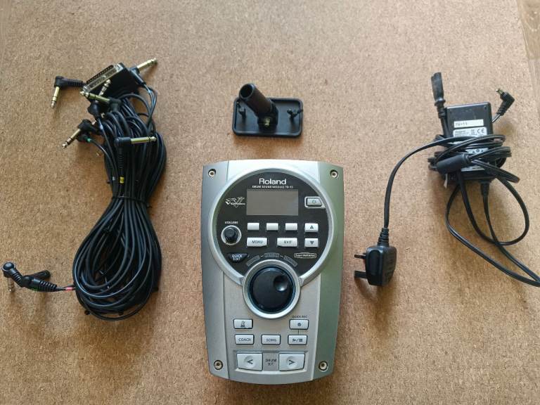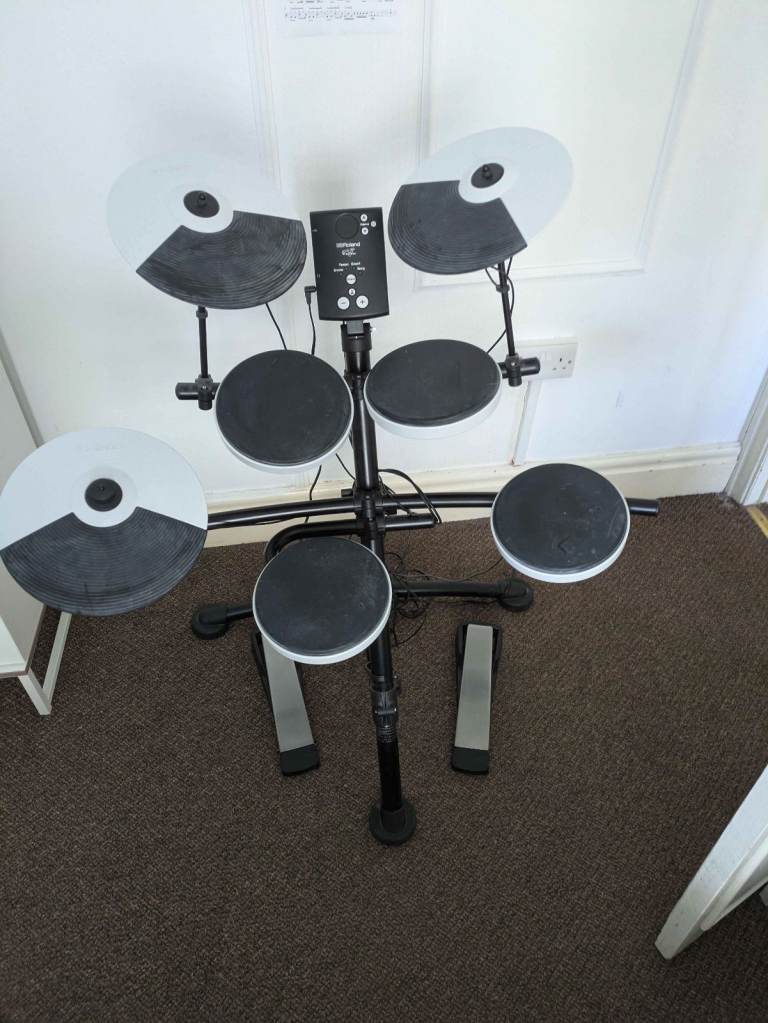 Electronic drumkit, ~8 years old but rarely used and in good condition. Some signs of wear on the pads. Hi-hat pedal works but can be unreliable. Includes instruction manual, sticks, key to adjust, and all cables.