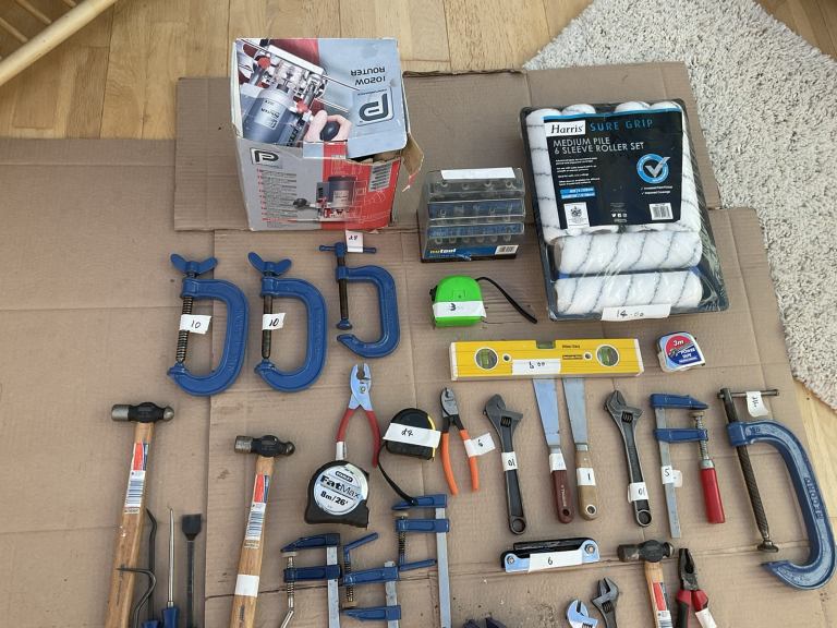 Various hand tools all in good condition, Record 8” 6” 4” G Clamps , other clamps , hammers, tape measures , spirit level . Having a clear out so come and have a look , paint roller set .Various prices and good value , Goring Worthing area