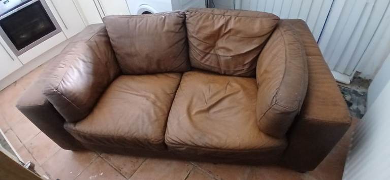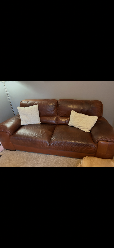 Two soft brown Italian leather sofas and grey leather footstool with storage. 2.1 metre length 95cm wide