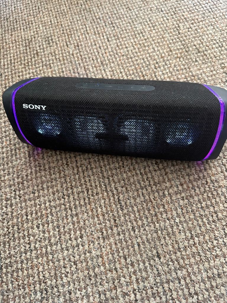 Good condition Sony portable Bluetooth speaker, perfect for music on the go or at home. It's black with cool purple and blue light effects that look great when playing tunes. The sound quality is excellent, as you'd expect from Sony, with deep bass.
