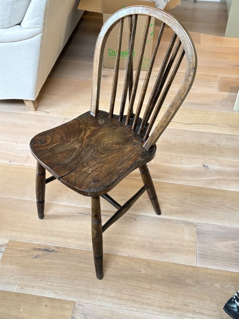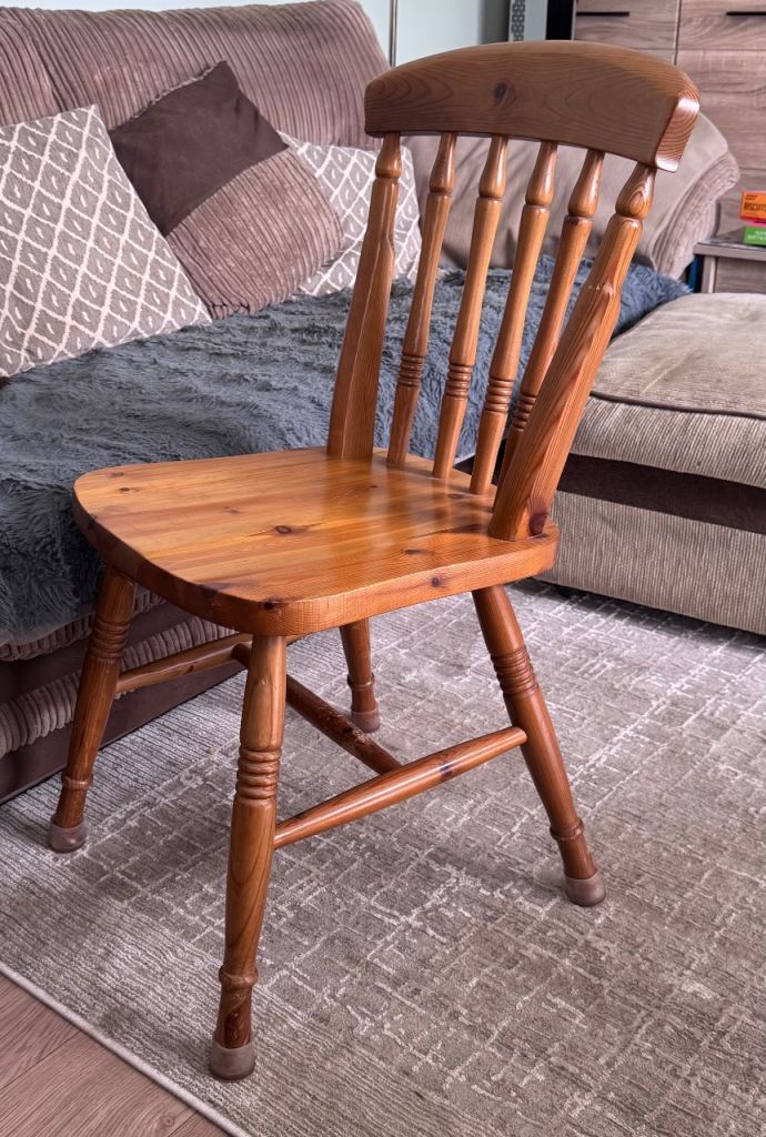 Lovely solid wood dining chair with a classic spindle back design. It's in good condition with minor signs of wear consistent with age, as expected from a used item. This chair is sturdy and comfortable, perfect for a kitchen or dining area. No major