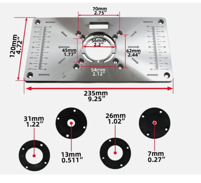 Aluminium Router Table Insert Plate for Woodworking Benches Router Plate Package List: 1 x Aluminium Router Table Plate 4 x Insert Ring 1 x Fixing Rod 16 x Screw 4 x Nut