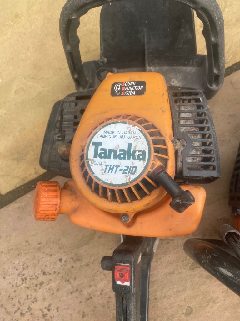 Tanaka 2 stroke strimmer and oil can with original manual. This is an Easy Start model though has not been used for many years and will require a comprehensive service.