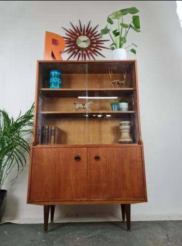 A vintage Danish style Teak wood bookcase mid century c1950s. Glass perfectly intact, very minor wear here or there as this is a vintage piece but has been re-oiled with Danish oil and is in very good condition overall. H140cm W91cm D29cm