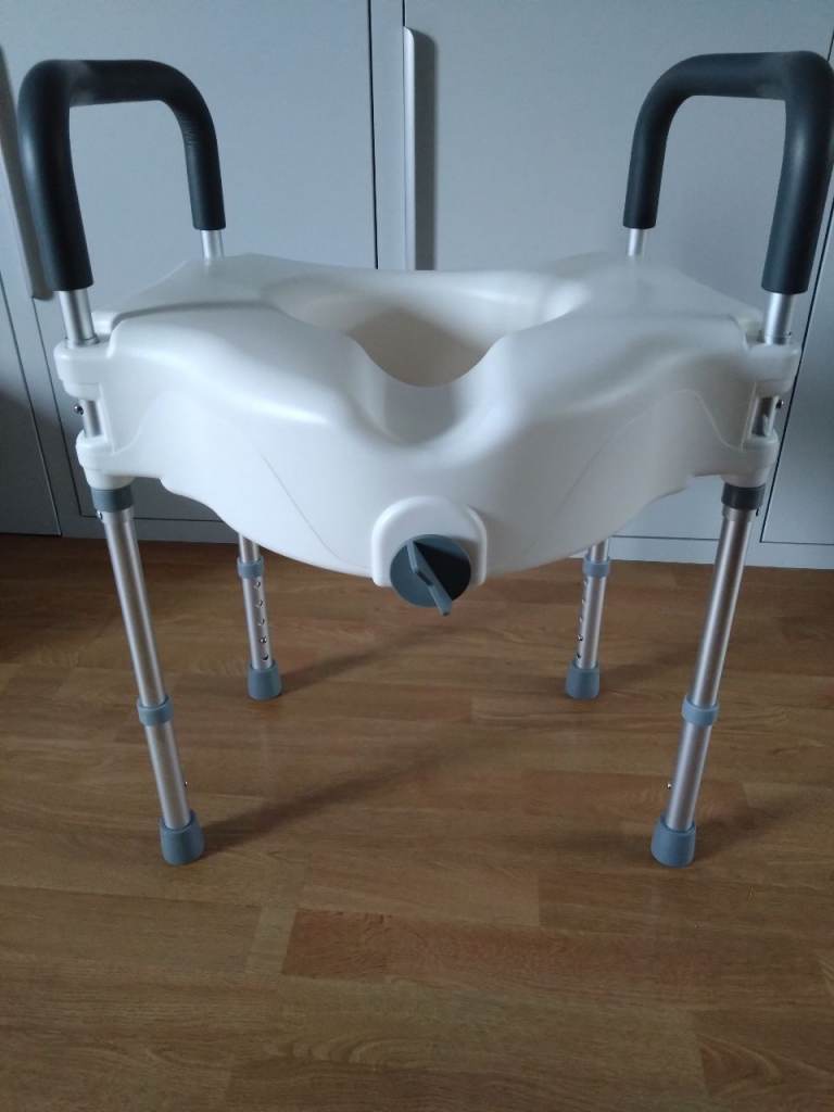 Adult toilet riser seat frame, adjustable with handles. Front screw secures against toilet to aid with stability and security of frame. Bought new and only used for 24 hours as adult didn't like it. Currently on nearly lowest setting which is