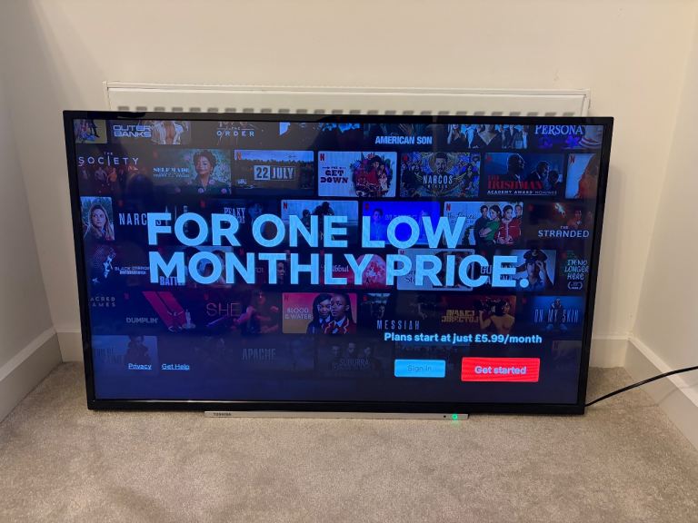 Toshiba 43-inch Smart television in good condition and well cared for. Fully working and reset, ready for a new owner. Includes the original Toshiba remote control with brand new batteries and the manufacturer’s instruction booklet. Built-in Sm