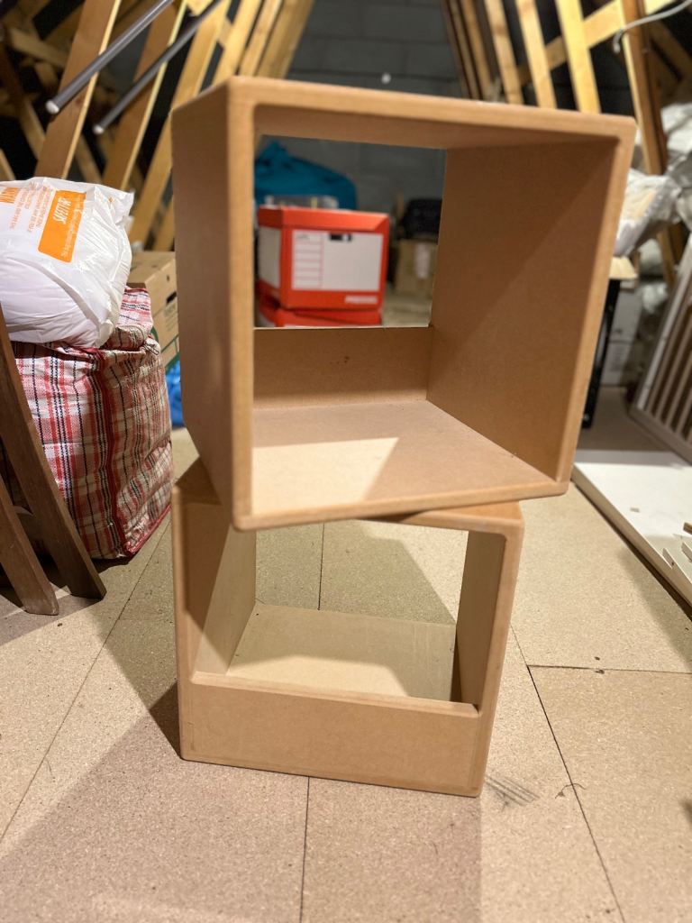 12 Inch Vinyl Record Storage Cube - 2 Units MDF construction with rounded edges. 100 album approximate capacity per cube, depended on cover widths. Ideal for home or office use. Couple of water marks on the top, should sand off or paint ove