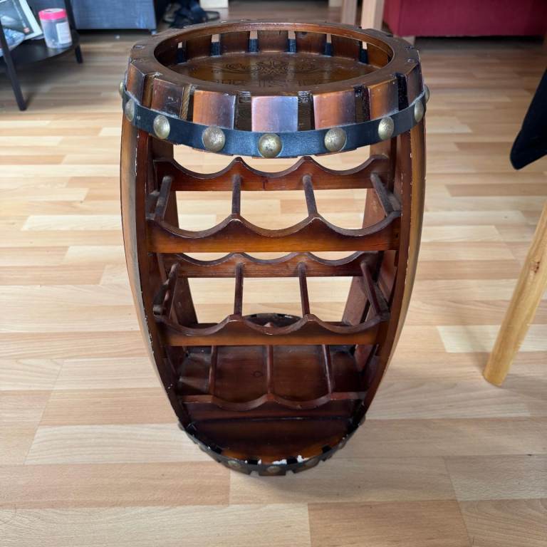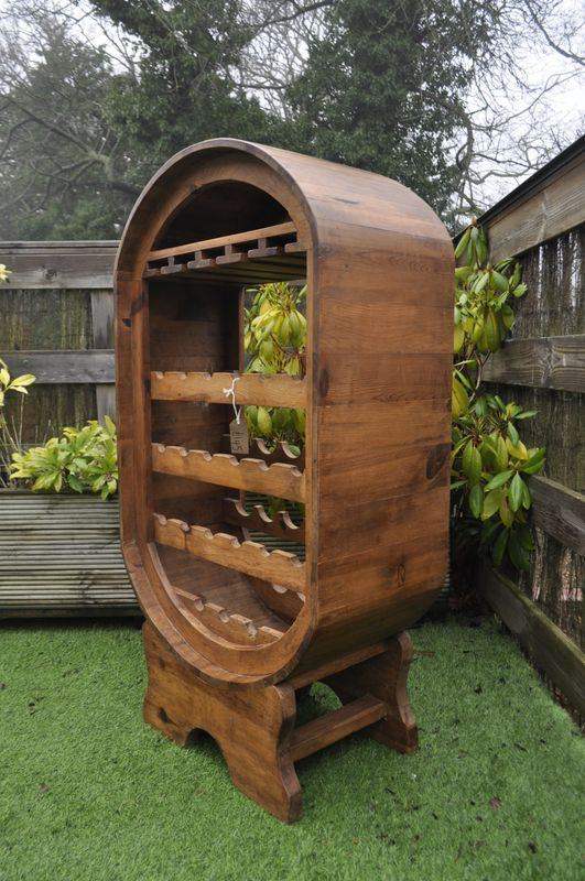 Rustic pine barrel shaped wine rack, housing for 21 bottles, glasses and a handy shelf above, 26 inches wide, 14.5 inches deep, 47.5 inches high, collection from Wolsingham or can arrange delivery for cost x