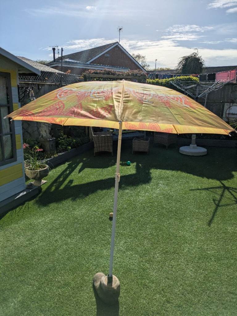 This compact parasol will be perfect in any garden space. It is in good condition and the tropical colours really brighten up any area.