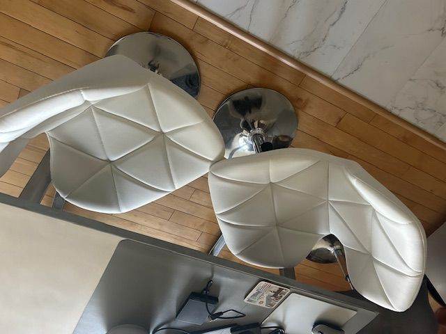 Stylish swivel dining/bar stool chairs. PU leather with stitched pattern. 2 mid-grey and 2 white. Chrome base. As new, easily dis-assembled and transported. Will sell separately if asked. Offers considered.