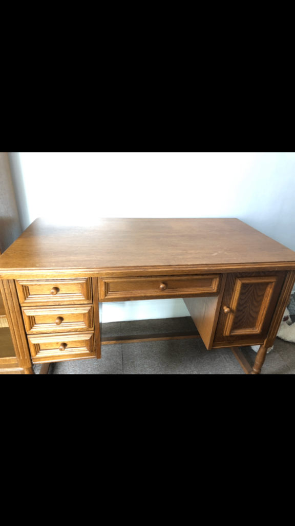 Beautiful oak furniture. Solid desk, with a couple of slight marks, as shown in photos. They take nothing away from the beauty of it. Height - 31 inches. Width- 48 inches. Depth- 26 inches. Bookcase, with six shelves. Slight chip on the base of