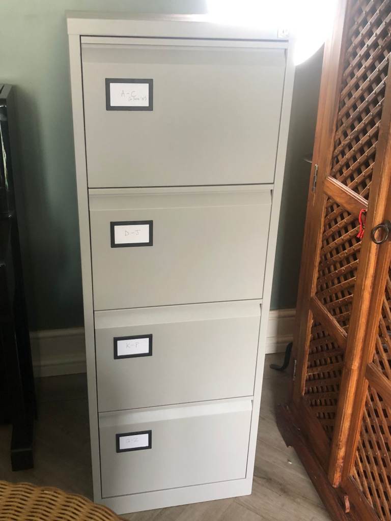 Lockable grey metal filing cabinet in very good condition apart from a couple of small scratches on the top. Comes with plenty of green suspension files (with tabs) also in very good condition.