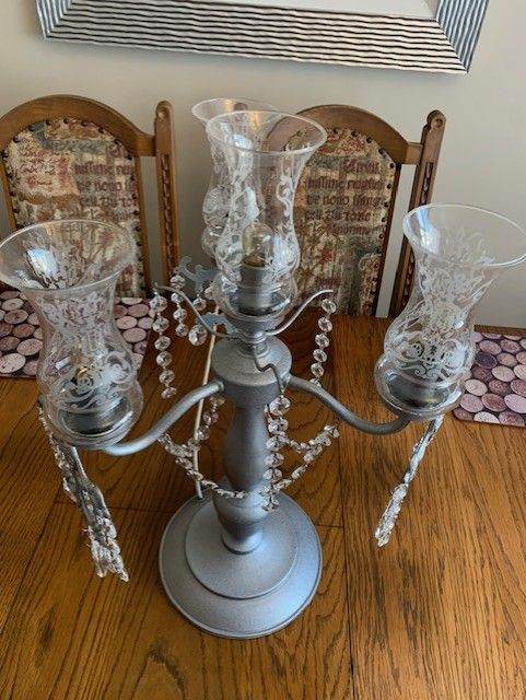 21"; high Crystal Chandelier table lamp with 4 etched glass shades in good working order with embellished Swarovski crystals. Beutiful decorative piece, including large bag of spare crystals. Heavy so collection only.