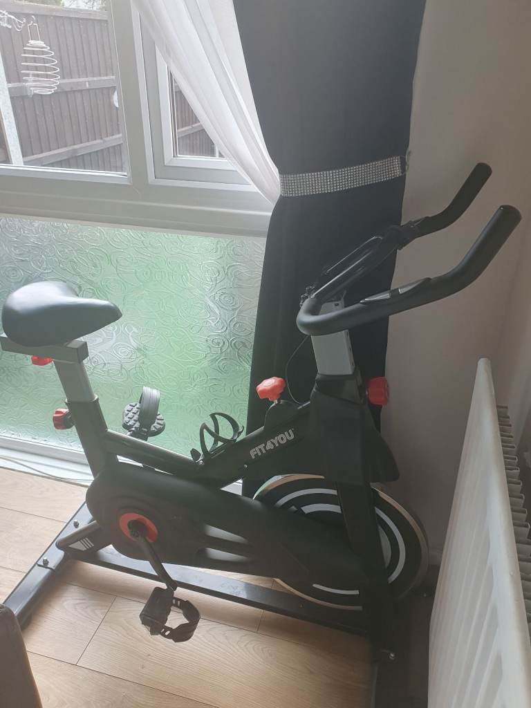 FIT4YOU spin bike. Excellent condition, will supply a can of silicone spray for flywheel. Only used a handful of times. Buyer must collect assembled as it comes, unless they want to dismantle it themselves
