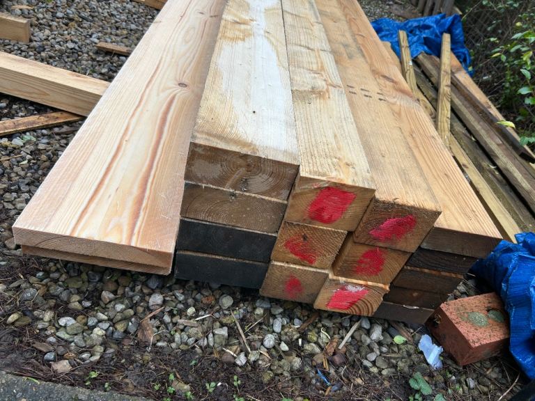 Job lot of wood £120 can deliver in york. 5x 4x2 lengths at 2.4m long. 6x 4x3 posts at 2.3m long. 4x 150mmx65mm sleepers at 2.6m long. 2x 225mmx38mm scaff boards 2.4m long. All the wood is new and straight. It is not treated.